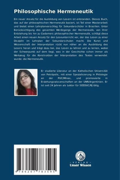 Ein neuer Ansatz für die Ausbildung von Lesern ist entstanden. Dieses Buch, das auf der philosophischen Hermeneutik basiert, ist Teil einer Masterarbeit und bietet einen Lehrplanvorschlag für Sekundarschüler in Brasilien. Unter Berücksichtigung des gesamten Werdegangs der Hermeneutik, von ihrer Entstehung bis hin zu Gadamers philosophischer Hermeneutik, schlägt diese Arbeit einen neuen Ansatz für den Leseunterricht vor, der das Lesen zu einer Disziplin im Lehrplan der Sekundarschulen macht. Die Kunst und Wissenschaft der Interpretation rückt nun näher an die Ausbildung des Lesers heran und trägt dazu bei, das Lesen zu lehren und zu lernen, wobei der Schwerpunkt auf dem liegt, was in der Geschichte schon immer als Werkzeug für die Konstruktion der Interpretation des Textes verwendet wurde: die Hermeneutik.