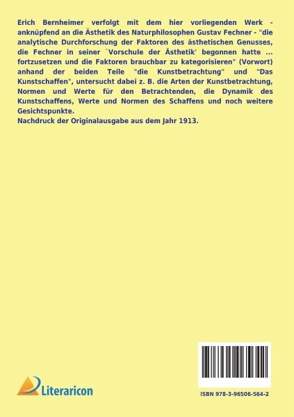 Erich Bernheimer verfolgt mit dem hier vorliegenden Werk - anknüpfend an die Ästhetik des Naturphilosophen Gustav Fechner - "die analytische Durchforschung der Faktoren des ästhetischen Genusses, die Fechner in seiner `Vorschule der Ästhetik' begonnen hatte ... fortzusetzen und die Faktoren brauchbar zu kategorisieren" (Vorwort) anhand der beiden Teile "die Kunstbetrachtung" und "Das Kunstschaffen", untersucht dabei z. B. die Arten der Kunstbetrachtung, Normen und Werte für den Betrachtenden, die Dynamik des Kunstschaffens, Werte und Normen des Schaffens und noch weitere Gesichtspunkte. Nachdruck der Originalausgabe aus dem Jahr 1913.