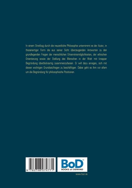 In einem Streifzug durch die neuzeitliche Philosophie unternimmt es der Autor, in thesenartiger Form die aus seiner Sicht überzeugenden Antworten zu den grundlegenden Fragen der menschlichen Erkenntnismöglichkeiten, der ethischen Orientierung sowie der Stellung des Menschen in der Welt mit knapper Begründung überblicksartig zusammenzufassen. Er will dazu anregen, sich mit diesen wichtigen Grundsatzfragen zu beschäftigen. Dabei geht es ihm vor allem um die Begründung für philosophische Positionen.