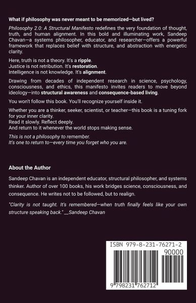 Philosophy 2.0: A Structural Manifesto by Sandeep Chavan What if philosophy wasn't abstract theory, but the operating manual of reality itself? What if truth wasn't something to believe in-but something you could align with, feel, and live through every ripple of consequence? Welcome to Philosophy 2.0-a bold and necessary redefinition of what it means to think, feel, act, and exist with structural clarity. In this powerful manifesto, independent philosopher and systems researcher Sandeep Chavan offers a sweeping yet grounded framework that replaces outdated philosophical loops with a consequence-aware, energetically aligned model for modern life. Drawing from decades of cross-disciplinary work-spanning physics, psychology, consciousness studies, ethics, education, and systems thinking-this work offers a new foundation for intelligence itself. Rejecting both ideological extremes and institutional stagnation, Chavan introduces key structural principles, including:Universal Energy Dynamics (UED): A new lens on matter, mind, and memory The Law of Consequences (LOC): A unifying principle beyond morality or karma The Mind-Soul-Consciousness Triad: A clear and practical model of human experience A structural rewrite of truth, justice, failure, fear, morality, purpose, and liberation Philosophy 2.0 also dismantles dangerous modern myths-like blind belief in science without consequence, education without alignment, and intelligence without ethics. This book is not a doctrine. It is not a summary of others' thinking. It is a living declaration of a universal framework-designed not for debate, but for implementation. Whether you're a thinker, teacher, scientist, policymaker, seeker, or student of life, this book will challenge your assumptions, refine your language, and reset your compass. "You're not here to follow a philosophy. You're here to live one-through intelligent alignment with what your actions create." Philosophy 2.0 is the field guide for those ready to exit illusion and enter clarity. Not a belief system. Not a reaction. A ripple-aware way of being.