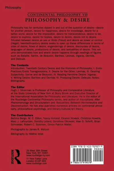 Philosophy and Desire , the seventh book in the well-known Continental Philosophy series, examines questions of desire--desire for another person, desire for happiness, desire for knowledge, desire for a better world, desire for the impossible, desire in text, desire in language and desire for desire itself. The theme of desire is explored through readings of contemporary figures such as Merleau-Ponty, Bataille, Sartre, de Beauvoir, Levinas, Irigaray, Barthes, Derrida, and Derrida. A hot, timely topic in philosophy today Expands the contemporary debates