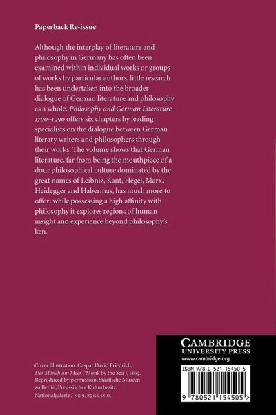 Although the importance of the interplay of literature and philosophy in Germany has often been examined within individual works or groups of works by particular authors, little research has been undertaken into the broader dialogue of German literature and philosophy as a whole. Philosophy and German Literature 1700-1990 offers six chapters by leading specialists on the dialogue between the work of German literary writers and philosophers through their works. The volume shows that German literature, far from being the mouthpiece of a dour philosophical culture dominated by the great names of Leibniz, Kant, Hegel, Marx, Heidegger and Habermas, has much more to offer: while possessing a high affinity with philosophy it explores regions of human insight and experience beyond philosophy's ken.