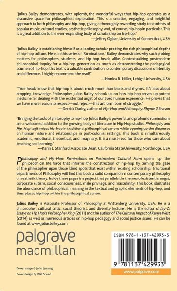 Philosophy and Hip-Hop: Ruminations on Postmodern Cultural Form opens up the philosophical life force that informs the construction of Hip-hop by turning the gaze of the philosopher upon those blind spots that exist within existing scholarship. Traditional Departments of Philosophy will find this book a solid companion in Contemporary Philosophy or Aesthetic Theory. Inside these pages is a project that parallels the themes of existential angst, corporate elitism, social consciousness, male privilege and masculinity. This book illustrates the abundance of philosophical meaning in the textual and graphic elements of Hip-hop, and thus places Hip-hop within the philosophical canon.