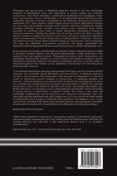 "If you thought reductionism about the mind was dead, think again: you may find John Bickle's vigorously and powerfully argued Philosophy and Neuroscience: A Ruthlessly Reductive Account a real eye-opener. His guiding idea is that the proof of reductionism is in the track record of reductionist research strategies in neuroscience, in explaining mentality and behavior - and even qualitative consciousness itself. And Bickle does not disappoint: he serves up a veritable feast of reductionist success stories, from deep down in cellular and molecular neuroscience. Some of the details he describes will amaze, and perhaps also delight, you. Bickle's discussion is invigorating as well as philosophically sophisticated, and his knowledge of current research in neuroscience is impressive indeed. The writing is clear, brisk, and refreshingly straightforward, and the book brims with enthusiasm and optimism. This is the latest salvo from the reductionist side, and a mighty one it is! It may not win the battle outright for reductionism, but it is going to change the shape and terms of the debate to come. A must read for those interested in the issues of psychoneural reduction and reductionism, and highly recommended to anyone with a broad interest in the philosophy of mind and psychology." (Jaegwon Kim, Brown University)