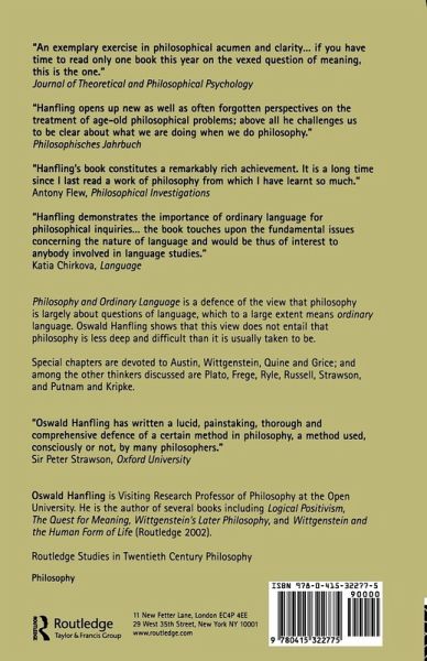 What is philosophy about and what are its methods? Philosophy and Ordinary Language is a defence of the view that philosophy is largely about questions of language, which to a large extent means ordinary language. Some people argue that if philosophy is about ordinary language, then it is necessarily less deep and difficult than it is usually taken to be but Oswald Hanfling shows us that this isn't true. Hanfling, a leading expert in the development of analytic philosophy, covers a wide range of topics, including scepticism and the definition of knowledge, free will, empiricism, folk psychology, ordinary versus artificial logic, and philosophy versus science. Drawing on philosophers such as Austin, Wittgenstein, and Quine, this book explores the nature of ordinary language in philosophy.