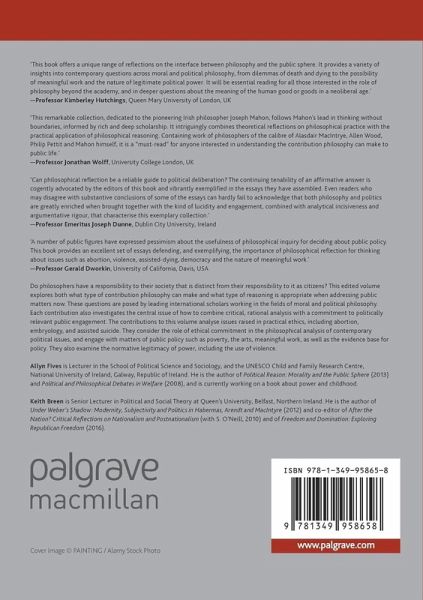 Acknowledgements-Notes on Contributors.- Introduction.- Part I Practical Ethics.- The Role of Philosophy in Public Matters.- On Philosophy's Contribution to Public Matters: Charting the Course of a Debate.- Abortion and the Right to Not Be Pregnant.- Acts, Omissions, and Assisted Death: Some Reflections on the Marie Fleming Case.- Part II Ethical Commitment and Political Engagement.- Writing as Social Disclosure: A Hundred Years Ago and Now.- Ethics, Markets, and Cultural Goods.- In Defence of Meaningful Work as a Public Policy Concern.- Working from Both Ends: The Dual Role of Philosophy in Research Ethics.- Part III The Justification of Power and Resistance.- Three Mistakes about Democracy.- Karl Marx after a Century and a Half.- Neither Victims nor Executioners: Camus as Public Intellectual Violence and Responsibility.- Index.