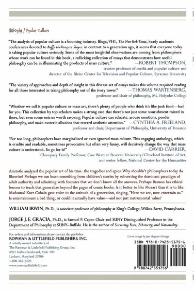Part 1 Acknowledgements Part 2 1. Philosophy Engages Popular Culture: An Introduction Part 3 Part I: Philosophy and Popular Culture Chapter 4 2. Philosophy and the Probably Impossible Chapter 5 3. Philosophy as/and/of Popular Culture Chapter 6 4. Allusion and Intention in Popular Art Chapter 7 5. On the Ties That Bind: Characters, the Emotions, and the Popular Fictions Chapter 8 6. Liking What's Good: Why Should We? Chapter 9 7. Popular Art and Entertainment Value Part 10 Part II: Interpretation and Popular Art Forms Chapter 11 8. Popular Culture and Spontaneous Order: Or How I Learned to Stop Worrying and Love the Tube Chapter 12 9. From Horror to Hero: Film Interpretations of Stocker's Dracula Chapter 13 10. Socrates at Story Hour: Philosophy as a Subversive Motif in Children's Literature Chapter 14 11. Of Batcaves and Clock-Towers: Living Damaged Lives in Gotham City Chapter 15 12. "American Pie" and the Self-Critique of Rock 'n' Roll Chapter 16 13. Photography, Popular Epistemology, Flexible Realism, and Holistic Pragmatism
