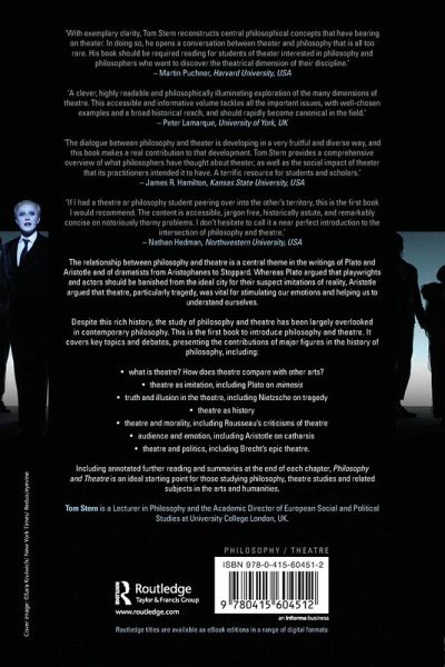 The relationship between philosophy and theatre is a central theme in the writings of Plato and Aristotle and of dramatists from Aristophanes to Stoppard. Where Plato argued that playwrights and actors should be banished from the ideal city for their suspect imitations of reality, Aristotle argued that theatre, particularly tragedy, was vital for stimulating our emotions and helping us to understanding ourselves. Despite this rich history the study of philosophy and theatre has been largely overlooked in contemporary philosophy. This is the first book to introduce philosophy and theatre. It covers key topics and debates, presenting the contributions of major figures in the history of philosophy, including: what is theatre? How does theatre compare with other arts? theatre as imitation, including Plato on mimesis truth and illusion in the theatre, including Nietzsche on tragedy theatre as history theatre and morality, including Rousseau's criticisms of theatre audience and emotion, including Aristotle on catharsis theatre and politics, including Brecht's Epic Theatre. Including annotated further reading and summaries at the end of each chapter, Philosophy and Theatre is an ideal starting point for those studying philosophy, theatre studies and related subjects in the arts and humanities.
