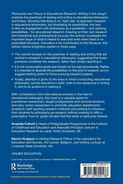 Philosophy and Theory in Educational Research: Writing in the margin explores the practices of reading and writing in educational philosophy and theory. Showing that there is no 'right way' to approach research in educational philosophy, but illustrating its possibilities, this text invites an engagement with philosophy as a possibility - and opening possibilities - for educational research. Drawing on their own research and theoretical and philosophical sources, the authors investigate the important issue of what it means to read and write when there is no prescribed structure. Innovative in its contribution to the literature, this edited volume enlightens readers in three ways. The volume focuses on the practices of reading and writing that are central to research in educational philosophy, suggesting that these practices constitute the research, rather than simply reporting it. It is not a prescriptive guide and should not be read procedurally. Rather, it is intended to illustrate the possibilities for this kind of research, and to suggest starting points for those pursuing research projects. Finally, attention is given to the ways in which conducting educational philosophy can be educative in itself, both to the researcher in writing it, and to its audience in reading it. With contributions from international scholars in the field of educational philosophy, this book is a valuable guide for practitioner-researchers, taught postgraduate and doctoral students, and early career researchers in university education departments. Academic staff teaching research methods and seeking to introduce their students to philosophy-as-research without wishing to offer a prescriptive 'how to' guide will also find this book of particular interest.