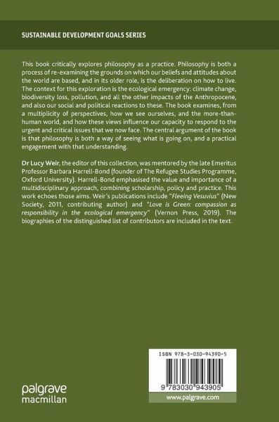 This book is about the meaning and purpose of philosophy as a way of, a practice of, responding to the ecological emergency, which includes climate change, biodiversity loss, pollution, habitat destruction, and all the associated impacts that fragment, and threaten to create collapse, among the systems that created and sustain us. There are the related economic and social impacts, the fragmentation of communities and political ideologies through attitude polarisation, and the increasing threats to systems by those who seek to promote further exploitation at the expense of attempts to regain some system of cooperation and an attitude of compassion which is at the heart of our survival strategies as a species.