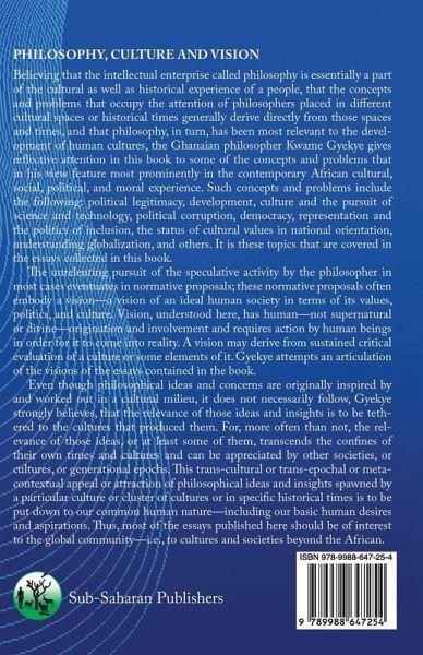 Believing that the intellectual enterprise called philosophy is essentially a part of the cultural as well as historical experience of a people, that the concepts and problems that occupy the attention of philosophers placed in different cultural spaces or historical times generally derive directly from those spaces and times, and that philosophy, in turn, has been most relevant to the development of human cultures, the Ghanaian philosopher Kwame Gyekye gives reflective attention in this book to some of the concepts and problems that in his view feature most prominently in the contemporary African cultural, social, political, and moral experience. Such concepts and problems include the following: political legitimacy, development, culture and the pursuit of science and technology, political corruption, democracy, representation and the politics of inclusion, the status of cultural values in national orientation, understanding globalization, and others. It is these topics that are covered in the essays collected in this book. The unrelenting pursuit of the speculative activity by the philosopher in most cases eventuates in normative proposals; these normative proposals often embody a vision-a vision of an ideal human society in terms of its values, politics, and culture. Vision, understood here, has human-not supernatural or divine-origination and involvement and requires action by human beings in order for it to come into reality. A vision may derive from sustained critical evaluation of a culture or some elements of it. Gyekye attempts an articulation of the visions of the essays contained in the book. Even though philosophical ideas and concerns are originally inspired by and worked out in a cultural milieu, it does not necessarily follow, Gyekye strongly believes, that the relevance of those ideas and insights is to be tetheed to the cultures that produced them. For, more often than not, the relevance of those ideas, or at least some of them, transcends the confines of their own times and cultures and can be appreciated by other societies, or cultures, or generational epochs. This trans-cultural or trans-epochal or metacontextual appeal or attraction of philosophical ideas and insights spawned by a particular culture or cluster of cultures or in specific historical times is to be put down to our common human nature-including our basic human desires and aspirations. Th us, most of the essays published here should be of interest to the global community-i.e., to cultures and societies beyond the African.