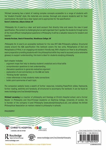 'Philosophy for A-Level is a clear and lucid account that directly links and covers the new A-Level specification. The content is challenging but so well organised that it guides the students through some of the most difficult metaphysical questions in Philosophy. It will be a valuable resource for student and teacher.'