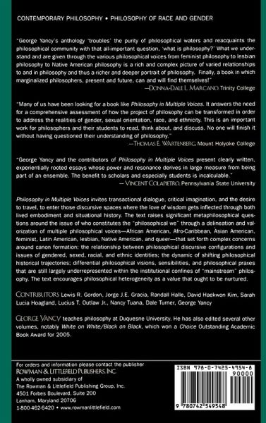 Philosophy in Multiple Voices invites transactional dialogue, critical imagination, and the desire to travel to enter those discursive spaces where the love of wisdom gets inflected through both lived embodiment and situational history. The text raises significant meta-philosophical questions around the issue of who constitutes the "philosophical we" through a delineation and valorization of multiple philosophical voices-African-American, Afro-Caribbean, Asian-American, Feminist, Latin-American, Lesbian, Native-American and Queer-that set forth complex concerns around canon formation, the relationship between philosophical discursive configurations and issues of gendered, sexed, racial and ethnic identities, the dynamic of shifting philosophical historical trajectories, differential philosophical visions, sensibilities, and philosophical praxes that are still largely underrepresented within the institutional confines of "mainstream" philosophy. The text encourages philosophical heterogeneity as a value that ought to be nurtured.