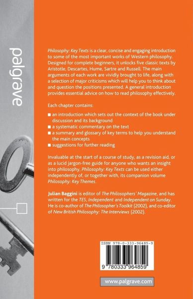 Designed for complete beginners, Philosophy: Key Texts is an introduction to philosophy and gives a clear, readable overview of some of the major texts by Plato, Descartes, Hume, Sartre, Mill and Nietzsche.