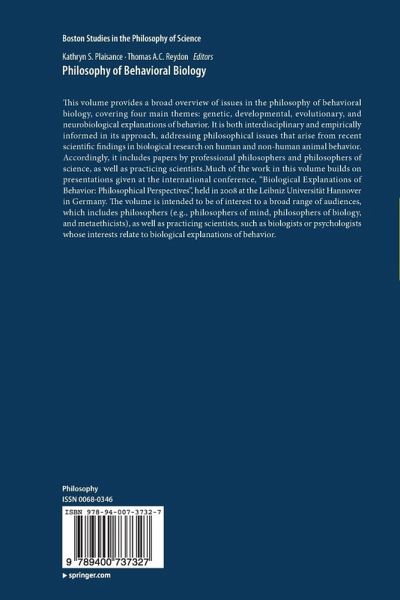 This volume provides a broad overview of issues in the philosophy of behavioral biology, covering four main themes: genetic, developmental, evolutionary, and neurobiological explanations of behavior. It is both interdisciplinary and empirically informed in its approach, addressing philosophical issues that arise from recent scientific findings in biological research on human and non-human animal behavior. Accordingly, it includes papers by professional philosophers and philosophers of science, as well as practicing scientists. Much of the work in this volume builds on presentations given at the international conference, "Biological Explanations of Behavior: Philosophical Perspectives", held in 2008 at the Leibniz Universität Hannover in Germany. The volume is intended to be of interest to a broad range of audiences, which includes philosophers (e.g., philosophers of mind, philosophers of biology, and metaethicists), as well as practicing scientists, such as biologists or psychologists whose interests relate to biological explanations of behavior.