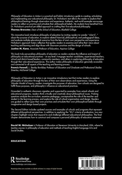 Philosophy of Education in Action: An Inquiry-Based Approach is a practical and holistic introductory guide to creating, articulating, and implementing your educational philosophy. A philosophy of education statement represents the teacher candidate's first attempt to put their fundamental thoughts and attitudes into words that will form the foundation for future classroom decisions. Dr. Nicholson's text allows the reader to explore their philosophical leanings through observation and experience. Authentic, real-world examples encourage readers to reflect on practice and articulate their philosophical beliefs. My students have benefited from Dr. Nicholson's practical yet skilled approach to crafting their first educational philosophy.