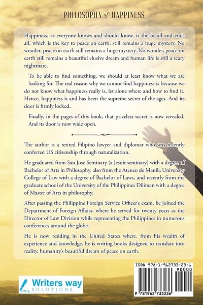Happiness, as everyone knows and should know, is the be-all and end-all, which is the key to peace on earth, still remains a huge mystery. No wonder, peace on earth, still remains a huge mystery. No wonder, peace on earth still remains a beautiful elusive dream and human life is still a scary nightmare. To be able to find something, we should at least now what we are looking for. The real reason why we cannot find happiness is because we do not know what happiness really is, let alone where and how to find it. Hence, happiness is and has been the supreme secret of the ages. And its door is firmly locked. Finally, in the pages of this book, that priceless secret is now revealed. And its door is now wide open. Come and enter the open door to heaven on earth. About the Author The author is a retired Filipino lawyer and diplomat who was recently conferred US citizenship through naturalization. He graduated from San Jose Seminary (a Jesuit seminary) with a degree of Bachelor of Arts in Philosophy, also from the Ateneo de Manila University College of Law with a degree of Bachelor of Laws, and recently from the graduate school of the University of the Philippines Diliman with a degree of Master of Arts in philosophy. After passing the Philippine Foreign Service Officer's exam, he joined the Department of Foreign Affairs, where he served for twenty years as the Director of Law Division while representing the Philippines in numerous conferences around the globe. He is now residing in the United States where, from his wealth of experience and knowledge, he is writing books designed to translate into reality, humanity's beautiful dream of peace on earth.