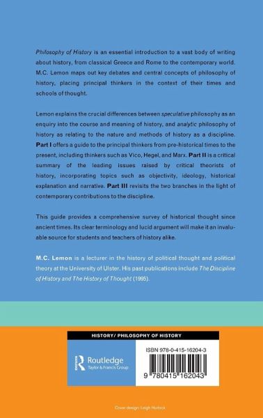 Philosophy of History is an essential introduction to a vast body of writing about history, from classical Greece and Rome to the modern world. M.C. Lemon maps out key debates and central concepts of philosophy of history, placing principal thinkers in the context of their times and schools of thought. Lemon explains the crucial differences between speculative philosophy as an enquiry into the content of history, and analytic philosophy of history as relating to the methods of history. The first two parts of the book trace each of these traditions, whereas the third part revisits both in the light of recent contributions to the discipline. This guide provides a comprehensive survey of historical thought since ancient times. Its clear terminology and lucid argument will make it an invaluable source for students and teachers alike.