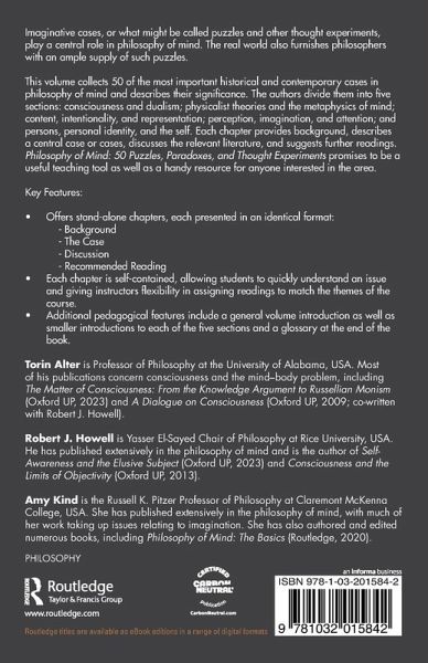 This volume collects 50 of the most important historical and contemporary cases in philosophy of mind and describes their significance. The authors divide them into five sections: consciousness and dualism; physicalist theories and the metaphysics of mind; content, intentionality, and representation; perception, imagination, and attention; and persons, personal identity, and the self. Each chapter provides background, describes a central case or cases, discusses the relevant literature, and suggests further readings. Philosophy of Mind: 50 Puzzles, Paradoxes, and Thought Experiments promises to be a useful teaching tool as well as a handy resource for anyone interested in the area.