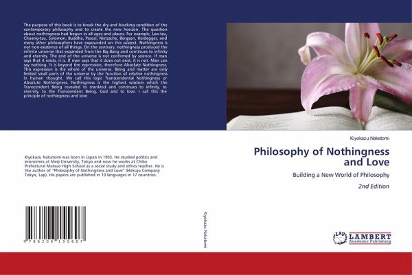 The purpose of this book is to break the dry and blocking condition of the contemporary philosophy and to create the new horizon. The question about nothingness had begun in all ages and places. For example, Lao-tzu, Chuang-tzu, Solomon, Buddha, Pascal, Nietzsche, Bergson, Heidegger, and many other philosophers have expounded on this subject. Nothingness is not non-existence of all things. On the contrary, nothingness produced the infinite universe that expanded from the Big Bang and continues to infinity and eternity. The end of the universe is not confirmed by science. If man says that it exists, it is. If man says that it does not exist, it is not. Man can say nothing. It is beyond the expression, therefore Absolute Nothingness. This expression is the whole of the universe. Being and matter are only limited small parts of the universe by the function of relative nothingness in human thought. We call this logic Transcendental Nothingness or Absolute Nothingness. Nothingness is the highest wisdom which the Transcendent Being revealed to mankind and continues to infinity, to eternity, to the Transcendent Being, God and to love. I call this the principle of nothingness and love.