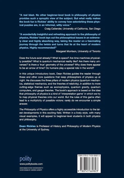In diesem einzigartigen Einführungsbuch führt Dean Rickles den Leser durch diese und andere Kernfragen, die Philosophen der Physik nicht ruhen lassen. Rickles erörtert drei Pfeiler der modernen Physik (Quantenmechanik, statistische Mechanik und Relativitätstheorien), neben weiteren noch aktuelleren Themen wie Econophysik, Quantengravität, Quantencomputer und Eichtheorien. Das Buch gründet auf der Vorstellung, dass die Philosophie der Physik eine Art Interpretationsspiel ist, bei dem versucht wird, physikalische Theorien auf unsere Welt zu übertragen. Aber die Spielregeln führen oft zu einer Vielzahl von Siegern: Eine einfache Antwort lässt sich selten finden.