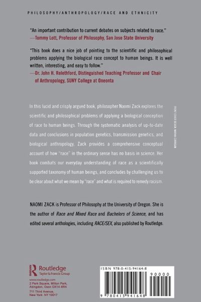 First published in 2003. In this concisely argued, short new book, well-known philosopher Naomi Zack explores the scientific and philosophical problems in applying a biological conception of race to human beings. Through the systematic analysis of up-to-date data and conclusions in population genetics, transmission genetics, and biological anthropology, Zack provides a comprehensive conceptual account of how race in the ordinary sense has no basis in science. Her book combats our everyday understanding of race as a scientifically supported taxonomy of human beings, and in conclusion challenges us to be clear about what we mean by race and what it would require to remedy racism.