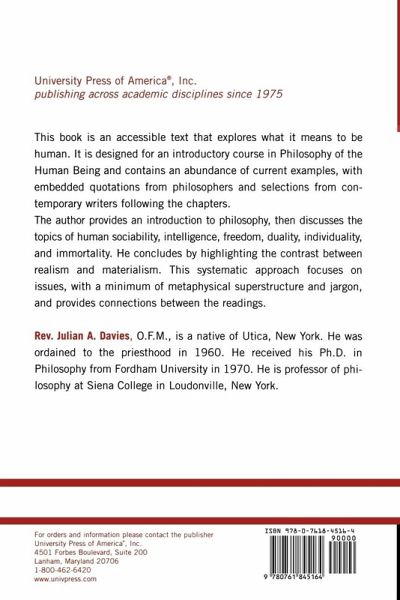 Chapter 1 The Philosophy of Philosophy Chapter 2 Human Sociability Chapter 3 Human Intelligence Chapter 4 Human Freedom Chapter 5 Human Duality Chapter 6 Human Individuality: the Person Chapter 7 Human Immortality Chapter 8 Taking Sides Chapter 9 Appendix: Rules of Definition
