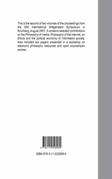 This is the second of two volumes of the proceedings from the 30th International Wittgenstein Symposium in Kirchberg, August 2007. It contains selected contributions on the Philosophy of media, Philosophy of the Internet, on Ethics and the political economy of information society. Also included are papers presented in a workshop on electronic philosophy resources and open source/open access.