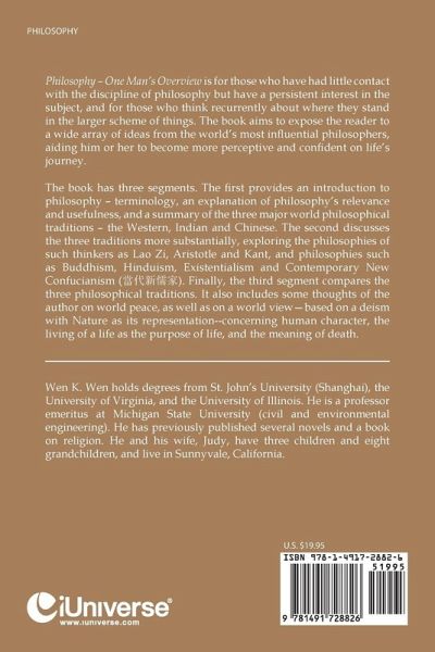 Philosophy - One Man's Overview is for those who have had little contact with the discipline of philosophy but have a persistent interest in the subject, and for those who think recurrently about where they stand in the larger scheme of things. The book aims to expose the reader to a wide array of ideas from the world's most influential philosophers, aiding him or her to become more perceptive and confident on life's journey. The book has three segments. The first provides an introduction to philosophy - terminology, an explanation of philosophy's relevance and usefulness, and a summary of the three major world philosophical traditions - the Western, Indian and Chinese. The second discusses the three traditions more substantially, exploring the philosophies of such thinkers as Lao Zi, Aristotle and Kant, and philosophies such as Buddhism, Hinduism, Existentialism and Contemporary New Confucianism (¿¿¿¿¿). Finally, the third segment compares the three philosophical traditions. It also includes some thoughts of the author on world peace, as well as on a world view-based on a deism with Nature as its representation--concerning human character, the living of a life as the purpose of life, and the meaning of death.