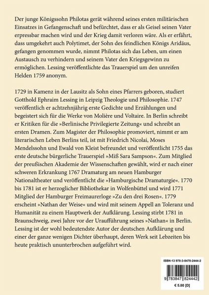 Gotthold Ephraim Lessing: Philotas. Ein Trauerspiel Lesefreundlicher Großdruck in 16-pt-Schrift Der junge Königssohn Philotas gerät während seines ersten militärischen Einsatzes in Gefangenschaft und befürchtet, dass er als Geisel seinen Vater erpressbar machen wird und der Krieg damit verloren wäre. Als er erfährt, dass umgekehrt auch Polytimet, der Sohn des feindlichen Königs Aridäus, gefangen genommen wurde, nimmt Philotas sich das Leben, um einen Austausch zu verhindern und seinem Vater den Kriegsgewinn zu ermöglichen. Lessing veröffentlichte das Trauerspiel um den unreifen Helden 1759 anonym. Großformat, 210 x 297 mm Berliner Ausgabe, 2019 Durchgesehener Neusatz mit einer Biographie des Autors bearbeitet und eingerichtet von Theodor Borken Erstdruck: Berlin (Voss) 1759 (anonym). Uraufführung am 24.1.1774 in Berlin. Textgrundlage ist die Ausgabe: Gotthold Ephraim Lessing: Werke. Herausgegeben von Herbert G. Göpfert in Zusammenarbeit mit Karl Eibl, Helmut Göbel, Karl S. Guthke, Gerd Hillen, Albert von Schirmding und Jörg Schönert, Band 1¿8, München: Hanser, 1970 ff. Umschlaggestaltung von Thomas Schultz-Overhage unter Verwendung des Bildes: Hendrik Frans Schaefels, Junger Gefangener in seiner Zelle, 19. Jahrhundert. Gesetzt aus der Minion Pro, 16 pt. Henricus Edition Deutsche Klassik UG (haftungsbeschränkt) Über den Autor: 1729 in Kamenz in der Lausitz als Sohn eines Pfarrers geboren, studiert Gotthold Ephraim Lessing in Leipzig Theologie und Philosophie. 1747 veröffentlich er achtzehnjährig erste Gedichte und Erzählungen und begeistert sich für die Werke von Molière und Voltaire. In Berlin schreibt er Kritiken für die »Berlinische Privilegierte Zeitung« und schreibt an ersten Dramen. Zum Magister der Philosophie promoviert, nimmt er am literarischen Leben Berlins teil, ist mit Friedrich Nicolai, Moses Mendelssohn und Ewald von Kleist befreundet und veröffentlicht 1755 das erste deutsche bürgerliche Trauerspiel »Miß Sara Sampson«. Zum Mitglied der preußischen Akademie der Wissenschaften gewählt, wird er nach einer schweren Erkrankung 1767 Dramaturg am neuen Hamburger Nationaltheater und veröffentlicht die »Hamburgische Dramaturgie«. 1770 bis 1781 ist er herzoglicher Bibliothekar in Wolfenbüttel und wird 1771 Mitglied der Hamburger Freimaurerloge »Zu den drei Rosen«. 1779 erscheint »Nathan der Weise« und wird mit seinem Appell an Toleranz und Humanität zu einem Hauptwerk der Aufklärung. Lessing stirbt 1781 in Braunschweig, zwei Jahre vor der Uraufführung seines »Nathan« in Berlin. Lessing ist der wohl bedeutendste Autor der deutschen Aufklärung und einer der ganze wenigen Dichter überhaupt, deren Werk seit Lebzeiten bis heute praktisch ununterbrochen aufgeführt wird.
