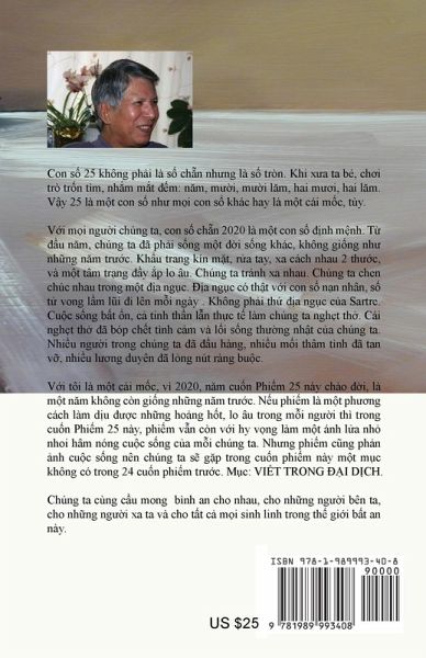 Con s¿ 25 không ph¿i là s¿ ch¿n nh¿ng là s¿ tròn. Khi x¿a ta bé, ch¿i trò tr¿n tìm, nh¿m m¿t ¿¿m: n¿m, m¿¿i, m¿¿i l¿m, hai m¿¿i, hai l¿m. V¿y 25 là m¿t con s¿ nh¿ m¿i con s¿ khác hay là m¿t cái m¿c, tùy. V¿i m¿i ng¿¿i chúng ta, con s¿ ch¿n 2020 là m¿t con s¿ ¿¿nh m¿nh. T¿ ¿¿u n¿m, chúng ta ¿ã ph¿i s¿ng m¿t ¿¿i s¿ng khác, không gi¿ng nh¿ nh¿ng n¿m tr¿¿c. Kh¿u trang kín m¿t, r¿a tay, xa cách nhau 2 th¿¿c, và m¿t tâm tr¿ng ¿¿y ¿p lo âu. Chúng ta tránh xa nhau. Chúng ta chen chúc nhau trong m¿t ¿¿a ng¿c. ¿¿a ng¿c có th¿t v¿i con s¿ n¿n nhân, s¿ t¿ vong l¿m l¿i ¿i lên m¿i ngày . Không ph¿i th¿ ¿¿a ng¿c c¿a Sartre. Cüc s¿ng b¿t ¿n, c¿ tinh th¿n l¿n th¿c t¿ làm chúng ta ngh¿t th¿. Cái ngh¿t th¿ ¿ã bóp ch¿t tình c¿m và l¿i s¿ng th¿¿ng nh¿t c¿a chúng ta. Nhi¿u ng¿¿i trong chúng ta ¿ã ¿¿u hàng, nhi¿u m¿i thâm tình ¿ã tan v¿, nhi¿u l¿¿ng duyên ¿ã l¿ng nút ràng büc. V¿i tôi là m¿t cái m¿c, vì 2020, n¿m cün Phi¿m 25 này chào ¿¿i, là m¿t n¿m không còn gi¿ng nh¿ng n¿m tr¿¿c. N¿u phi¿m là m¿t ph¿¿ng cách làm d¿u ¿¿¿c nh¿ng höng h¿t, lo âu trong m¿i ng¿¿i thì trong cün Phi¿m 25 này, phi¿m v¿n còn v¿i hy v¿ng làm m¿t ánh l¿a nh¿ nhoi hâm nóng cüc s¿ng c¿a m¿i chúng ta. Nh¿ng phi¿m c¿ng ph¿n ¿nh cüc s¿ng nên chúng ta s¿ g¿p trong cün phi¿m này m¿t m¿c không có trong 24 cün phi¿m tr¿¿c. M¿c: VI¿T TRONG ¿¿I D¿CH. Chúng ta cùng c¿u mong bình an cho nhau, cho nh¿ng ng¿¿i bên ta, cho nh¿ng ng¿¿i xa ta và cho t¿t c¿ m¿i sinh linh trong th¿ gi¿i b¿t an này.