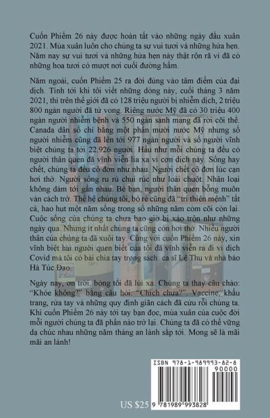 Cün Phi¿m 26 này ¿¿¿c hoàn t¿t vào nh¿ng ngày ¿¿u xuân 2021. Mùa xuân luôn cho chúng ta s¿ vui t¿¿i và nh¿ng h¿a h¿n. N¿m nay s¿ vui t¿¿i và nh¿ng h¿a h¿n này th¿t r¿n rã vì ¿ã có nh¿ng hoa t¿¿i c¿ m¿¿t n¿i cüi ¿¿¿ng h¿m. N¿m ngoái, cün Phi¿m 25 ra ¿¿i ¿úng vào tâm ¿i¿m c¿a ¿¿i d¿ch. Tính t¿i khi tôi vi¿t nh¿ng dòng này, cüi tháng 3 n¿m 2021, thì trên th¿ gi¿i ¿ã có 128 tri¿u ng¿¿i b¿ nhi¿m d¿ch, 2 tri¿u 800 ngàn ng¿¿i ¿ã t¿ vong. Riêng n¿¿c M¿ ¿ã có 30 tri¿u 400 ngàn ng¿¿i nhi¿m b¿nh và 2 tri¿u 800 sanh m¿ng ¿ã r¿i cõi th¿. Canada dân s¿ ch¿ b¿ng m¿t ph¿n m¿¿i n¿¿c M¿ nh¿ng s¿ ng¿¿i nhi¿m c¿ng ¿ã lên t¿i 977 ngàn ng¿¿i và s¿ ng¿¿i v¿nh bi¿t chúng ta t¿i 22.926 ng¿¿i. H¿u nh¿ m¿i chúng ta ¿¿u có ng¿¿i thân quen ¿ã v¿nh vi¿n lìa xa vì c¿n d¿ch này. S¿ng hay ch¿t, chúng ta ¿¿u cô ¿¿n nh¿ nhau. Ng¿¿i ch¿t cô ¿¿n lúc c¿n h¿i th¿. Ng¿¿i s¿ng ru rú chui rúc nh¿ loài chüt. Nhân löi không dám t¿i g¿n nhau. Bè b¿n, ng¿¿i thân quen b¿ng muôn vàn cách tr¿. Th¿ h¿ chúng tôi, b¿ r¿ c¿ng ¿ã "tri thiên m¿nh" t¿t c¿, hao h¿t m¿t n¿m s¿ng trong s¿ nh¿ng n¿m còm cõi còn l¿i. Cüc s¿ng c¿a chúng ta ch¿a bao gi¿ b¿ xáo tr¿n nh¿ nh¿ng ngày qua. Nh¿ng ít nh¿t chúng ta c¿ng còn h¿i th¿. Nhi¿u ng¿¿i thân c¿a chúng ta ¿ã xuôi tay. Cùng v¿i cün Phi¿m 26 này, xin v¿nh bi¿t hai ng¿¿i quen bi¿t c¿a tôi ¿ã v¿nh vi¿n ra ¿i vì d¿ch Covid mà tôi có bài chia tay trong sách: ca s¿ L¿ Thu và nhà báo Hà Túc ¿¿o. Ngày nay, ¿n tr¿i, bóng t¿i ¿ã lùi xa. Chúng ta thay câu chào: "Kh¿e không?" b¿ng câu h¿i: "Chích ch¿a?". Vaccine, kh¿u trang, r¿a tay và nh¿ng quy ¿¿nh giãn cách ¿ã c¿u r¿i chúng ta. Khi cün Phi¿m 26 này t¿i tay b¿n ¿¿c, mùa xuân c¿a cüc ¿¿i m¿i ng¿¿i chúng ta ¿ã ph¿n nào tr¿ l¿i. Chúng ta ¿ã có th¿ v¿ng d¿ chúc nhau nh¿ng n¿m tháng an lành s¿p t¿i. Mong s¿ là mãi mãi an lành!