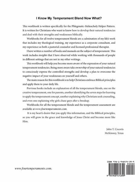 I Know My Temperament Blend Now What? This workbook is written for Christians who want to know how to develop their natural tendencies and deal with their strengths and weaknesses biblically. Workbooks for all twelve temperament blends are a culmination of my life's work that includes my theological training, my experience as a corporate consultant, and my experience as both a pastorial counselor and licensed professional therapist. I have written a number of books and manuals on the subject of temperament. This work includes insights that I have observed while working with thousands of people in different settings that are not in my other writings. This workbook will help you become more aware of the expression of your natural temperament tendencies. Being more aware take ownership of your natural tendencies to consciously express the controlled strengths and develop a plan to overcome the negative impact of your weaknesses on yourself and others. The main reason for this workbook is to help Christians embrace Biblical principles and apply them to your daily life. Previous books include an explanation of all the temperament blends, one on the creative temperament, one for parents, another identifying the seven steps for learning to apply the temperament concept, another explaining why Christians seek counseling, and even one explaining why girls chase guys after a breakup. Workbooks for all the temperament blends and the temperament assessment are available at www.fourtemperaments.com. It is my heart's desire that you apply this information, and the Biblical principles, so you will grow in the grace and knowledge of Jesus Christ and become more like Him.