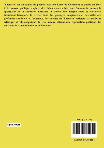 "Phénissa" est un recueil de poèmes écrit par Remy de Gourmont et publié en 1908. Cette ¿uvre poétique explore des thèmes variés tels que l'amour, la nature, la spiritualité et la condition humaine. À travers une langue riche et évocatrice, Gourmont transporte le lecteur dans des paysages imaginaires et des réflexions profondes sur la vie et l'existence. Les poèmes de "Phénissa" reflètent la sensibilité artistique et philosophique de leur auteur, offrant une exploration poétique des mystères de l'âme humaine et de l'univers.