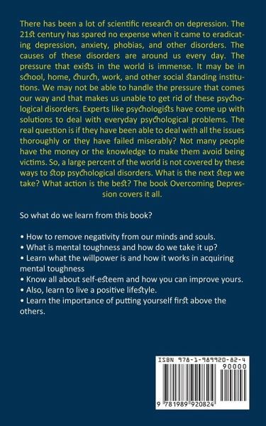There has been a lot of scientific research on depression. The 21st century has spared no expense when it came to eradicating depression, anxiety, phobias, and other disorders. The causes of these disorders are around us every day. The pressure that exists in the world is immense. It may be in school, home, church, work, and other social standing institutions. We may not be able to handle the pressure that comes our way and that makes us unable to get rid of these psychological disorders. Experts like psychologists have come up with solutions to deal with everyday psychological problems. The real question is if they have been able to deal with all the issues thoroughly or they have failed miserably? Not many people have the money or the knowledge to make them avoid being victims. So, a large percent of the world is not covered by these ways to stop psychological disorders. What is the next step we take? What action is the best? The book Overcoming Depression covers it all. YOU WILL LEARN: So what do we learn from this book?How to remove negativity from our minds and souls.What is mental toughness and how do we take it up?Learn what the willpower is and how it works in acquiring mental toughnessKnow all about self-esteem and how you can improve yours.Also, learn to live a positive lifestyle.Learn the importance of putting yourself first above the others.