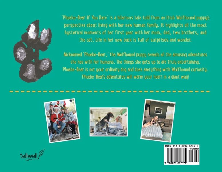 "Phoebe-Bear If You Dare" is a hilarious tale told from an Irish Wolfhound puppy's perspective about living with her new human family. It highlights all the most hysterical moments of her first year with her mom, dad, two brothers, and the cat. Life in her new pack is full of surprises and wonder. Nicknamed "Phoebe-Bear," the Wolfhound puppy reveals all the amusing adventures she has with her humans. The things she gets up to are truly entertaining. Phoebe-Bear is not your ordinary dog and does everything with Wolfhound curiosity. Phoebe-Bear's adventures will warm your heart in a giant way!