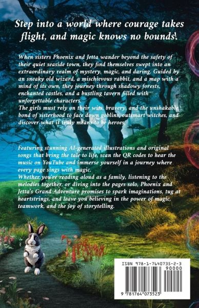 When sisters Phoenix and Jetta wander beyond the safety of their quiet seaside town, they find themselves swept into an extraordinary realm of mystery, magic, and daring. Guided by an sneaky old wizard, a mischievous rabbit, and a map with a mind of its own, they journey through shadowy forests, enchanted castles, and a bustling tavern filled with unforgettable characters. The girls must rely on their wits, bravery, and the unshakable bond of sisterhood to face down goblins, outsmart witches, and discover what it truly means to be heroes. Featuring stunning AI-generated illustrations and original songs that bring the tale to life, scan the QR codes to hear the music on YouTube and immerse yourself in a journey where every page sings with magic. Whether you're reading aloud as a family, listening to the melodies together, or diving into the pages solo, Phoenix and Jetta's Grand Adventure promises to spark imaginations, tug at heartstrings, and leave you believing in the power of magic, teamwork, and the joy of storytelling. Step into a world where courage takes flight, and magic knows no bounds!