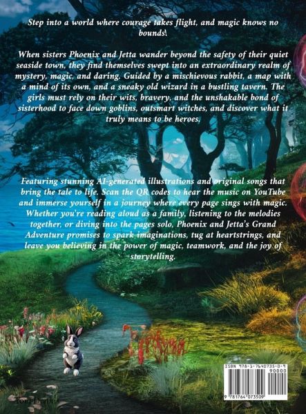 When sisters Phoenix and Jetta wander beyond the safety of their quiet seaside town, they find themselves swept into an extraordinary realm of mystery, magic, and daring. Guided by an sneaky old wizard, a mischievous rabbit, and a map with a mind of its own, they journey through shadowy forests, enchanted castles, and a bustling tavern filled with unforgettable characters. The girls must rely on their wits, bravery, and the unshakable bond of sisterhood to face down goblins, outsmart witches, and discover what it truly means to be heroes. Featuring stunning AI-generated illustrations and original songs that bring the tale to life, scan the QR codes to hear the music on YouTube and immerse yourself in a journey where every page sings with magic. Whether you're reading aloud as a family, listening to the melodies together, or diving into the pages solo, Phoenix and Jetta's Grand Adventure promises to spark imaginations, tug at heartstrings, and leave you believing in the power of magic, teamwork, and the joy of storytelling. Step into a world where courage takes flight, and magic knows no bounds!