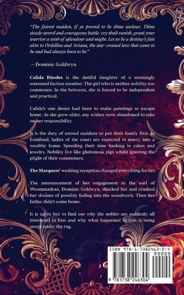 "The fairest maiden, if ye proved to be thine saviour. Thine steady sword and courageous battle-cry shalt vanish, grant your warrior a wish of splendour and might. Let us be a destiny's fate akin to Ordellius and Aviana, the star-crossed love that came to be and had always been to be."¿ - Dominic Goldwyn Calida Rhodes is the dutiful daughter of a seemingly esteemed faction member. The girl who is neither nobility nor commoner. In the between, she is forced to be independent and practical. Calida's one desire had been to make paintings to escape home. As she grew older, any wishes were abandoned to take on her responsibility. It is the duty of unwed maidens to put their family first. In Eonifond, ladies of the court are expected to marry into a wealthy home. Spending their time basking in cakes and jewelry. Nobility live like gluttonous pigs whilst ignoring the plight of their commoners. The Marquess' wedding reception changed everything for her. The announcement of her engagement to the earl of Weommadran, Dominic Goldwyn, shocked her and crushed her dreams of possibly fading into the woodwork. Then her father didn't come home. It is up to her to find out why the nobles are suddenly all interested in him and why what happened to him is being swept under the rug.