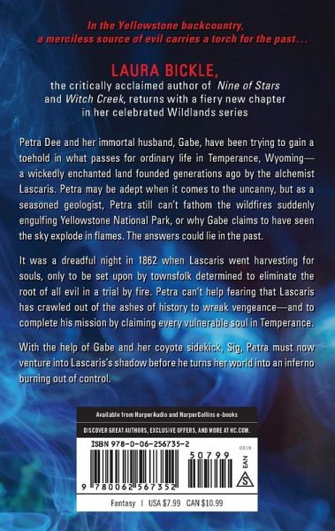 In the Yellowstone backcountry, a merciless source of evil carries a torch for the past . . . Petra Dee and her immortal husband, Gabe, have been trying to gain a toehold in what passes for ordinary life in Temperance, Wyoming—a wickedly enchanted land founded generations ago by the alchemist Lascaris. Petra may be adept when it comes to the uncanny, but as a seasoned geologist, Petra still can’t fathom the wildfires suddenly engulfing Yellowstone National Park, or why Gabe claims to have seen the sky explode in flames. The answers could lie in the past. It was a dreadful night in 1862 when Lascaris went harvesting for souls, only to be set upon by townsfolk determined to eliminate the root of all evil in a trial by fire. Petra can’t help fearing that Lascaris has crawled out of the ashes of history to wreak vengeance—and to complete his mission by claiming every vulnerable soul in Temperance. With the help of Gabe and her coyote sidekick, Sig, Petra must now venture into Lascaris’s shadow before he turns her world into an inferno burning out of control.