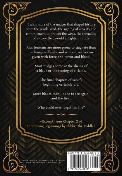 I wish more of the nudges that shaped history were the gentle kind-the signing of a treaty, the commitment to protect the weak, the spreading of a story that would enlighten minds. Alas, humans are more prone to stagnate than to change willingly, and so most nudges are given with force and terror and blood. Most nudges come at the slicing of a blade or the searing of a flame. The final chapters of Sable's beginning certainly did. More blades than I hope to see again, and the fire... Who could ever forget the fire? -Excerpt from Chapter 2 of "Interesting Beginnings" by Flibbet the Peddler