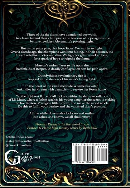 Three of the six titans have abandoned our world. They leave behind their champions, the beacons of hope against the betrayer goddess Alessandra's pressing night. But as the years pass, that hope fades. We wait in twilight. Over a decade ago, the champions went into hiding. In their absence, the fires of rebellion flicker and dim. We fight for glimpses of embers, for a spark of hope to reignite the flame. Marcon's ember flares to life upon the battlefields of Respite. A deadly conflagration sets his path apart. Quindythias's revolutionary fire is trapped in the shadow of his sister's fading light. In the heart of the vast Emeraude, a nameless witch enkindles her dream with a match-to restore her forest home. Yet the brightest flame of all flickers within the dense woodlands of Lis-Maen, where a father teaches his young daughter the secret to stoking the fire: Restore Verdigris, little Rowan, and make the world whole. Do this to fulfill your destiny and the vanished titan's promise. All the while, Alessandra looks on and smiles. Into ashes, she knows, we all shall return. Phoenix Rising is the first novel in the Feather & Flame high fantasy series by Beth Ball.