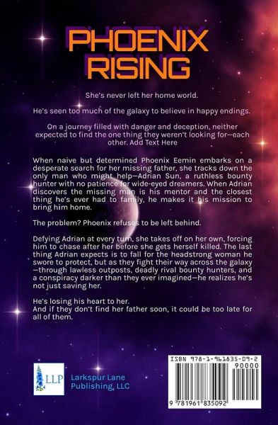 She's never left her home world. He's seen too much of the galaxy to believe in happy endings. On a journey filled with danger and deception, neither expected to find the one thing they weren't looking for-each other. When naive but determined Phoenix Eemin embarks on a desperate search for her missing father, she tracks down the only man who might help-Adrian Sun, a ruthless bounty hunter with no patience for wide-eyed dreamers. When Adrian discovers the missing man is his mentor and the closest thing he's ever had to family, he makes it his mission to bring him home. The problem? Phoenix refuses to be left behind. Defying Adrian at every turn, she takes off on her own, forcing him to chase after her before she gets herself killed. The last thing Adrian expects is to fall for the headstrong woman he swore to protect, but as they fight their way across the galaxy-through lawless outposts, deadly rival bounty hunters, and a conspiracy darker than they ever imagined-he realizes he's not just saving her. He's losing his heart to her. And if they don't find her father soon, it could be too late for all of them.