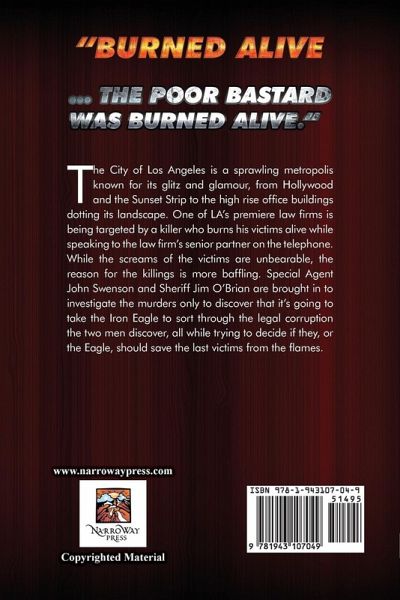 "Burned alive ... the poor bastard was burned alive." The City of Los Angeles is a sprawling metropolis known for its glitz and glamour, from Hollywood and the Sunset Strip to the high rise office buildings dotting its landscape. One of LA's premiere law firms is being targeted by a killer who burns his victims alive while speaking to the law firm's senior partner on the telephone. While the screams of the victims are unbearable, the reason for the killings is more baffling. Special Agent John Swenson and Sheriff Jim O'Brian are brought in to investigate the murders only to discover that it's going to take the Iron Eagle to sort through the legal corruption the two men discover, all while trying to decide if they, or the Eagle, should save the last victims from the flames. Inside Flap: The Law Office of Cohen, Miller & Hyde is one of the oldest and most recognized law firms in Los Angeles. Howard Cohen, the firm's founding partner, is the recipient of several phone calls from a killer with a grudge. Cohen can only listen helplessly as his senior partners are burned alive, pleading for mercy. The murders are personal, and Cohen recruits the Sheriff's department as well as Special Agent John Swenson of the FBI to solve them. As the two men begin their investigation, a conspiracy of momentous proportions unfolds - one that encompasses not only prominent Los Angeles lawyers and law firms, but also the whole judiciary system, revealing corruption so deep that only the Iron Eagle dare expose it - leaving Swenson and O'Brian with an ethical dilemma: should they or the Iron Eagle stop the killings?