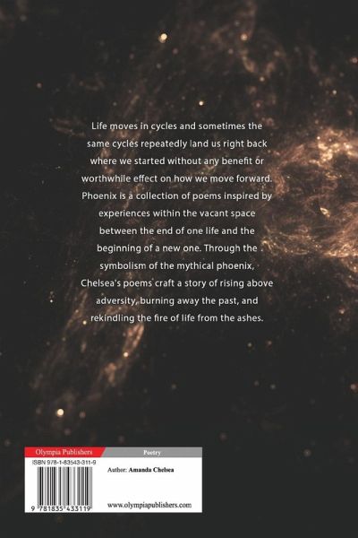 Life moves in cycles and sometimes the same cycles repeatedly land us right back where we started without any benefit or worthwhile effect on how we move forward. Phoenix is a collection of poems inspired by experiences within the vacant space between the end of one life and the beginning of a new one. Through the symbolism of the mythical phoenix, Chelsea's poems craft a story of rising above adversity, burning away the past, and rekindling the fire of life from the ashes.