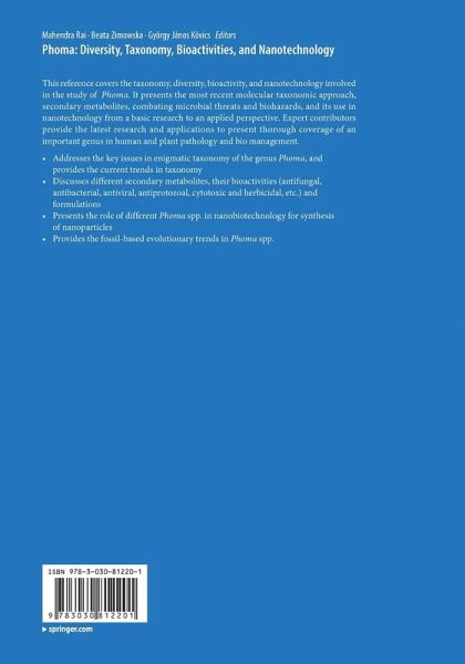 Part 1-General Identity and Taxonomy.- Phoma: An Overview.- Phoma Diseases-Identification, Epidemiology and Management.- Taxonomical Evaluation of Phoma-History of Classification, Current Status and Future Directions.- Part 2-Diversity, Diseases and Host Range.- Biodiversity of the Genus Phoma in Different Habitats.- Phoma on Medicinal and Aromatic Plants.- Types of Plant Diseases Caused by Phoma Species and Their Integrated Management.- Plant Pathogenic Phoma Species: Host Range, Symptoms and Distribution.- Overview of Phoma-like Fungi on Legumes: Papilionaceous plants): Pea, Beans, Soybean, Chickpea and Faba Beans.- Vegetable Diseases Caused by Phoma SSP.- Part 3: Phoma Spp. as a Human Pathogen.- Phoma as an Infectious Pathogen in Medical Practice.- Part 4- Bioactivities and Nanotechnology.- Genus Phoma; A Review of Its Potential Bioactivities, Implications and Prospects.- Bioherbicidal Activity of Phoma macrostoma.- Fruitful Decade for Phoma Secondary Metabolites From 2011 to 2020: Chemistry, Chemical Diversity and Biological Activities.- Plant Growth Promoting Phoma spp..- Biological Management of Plant Diseases by Non-Pathogenic Phoma spp..- Endophytic Phoma: Potentials and Limitations.- Bioactive Secondary Metabolites of Endophytic Phoma: Biochemistry and Signifigance.- Exploitation of Phoma for Fabrication of Silver Nanoparticles.