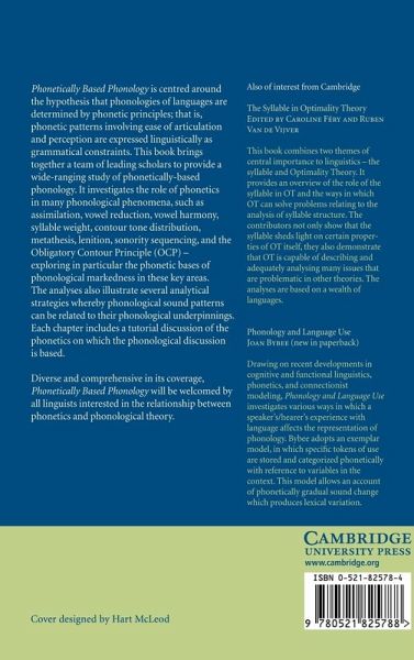 Phonetically based phonology is centred around the hypothesis that phonologies of languages are determined by phonetic principles; that is, phonetic patterns involving ease of articulation and perception are expressed linguistically as grammatical constraints. This book brings together a team of scholars to provide a wide-ranging study of phonetically-based phonology. It investigates the role of phonetics in many phonological phenomena - such as assimilation, vowel reduction, vowel harmony, syllable weight, contour line distribution, metathesis, lenition, sonority sequencing, and the Obligatory Contour Principle (OCP) - exploring in particular the phonetic bases of phonological markedness in these key areas. The analyses also illustrate several analytical strategies whereby phonological sound patterns can be related to their phonological underpinnings. Each chapter includes a tutorial discussion of the phonetics on which the phonological discussion is based. Diverse and comprehensive in its coverage, Phonetically-based Phonology will be welcomed by all linguists interested in the relationship between phonetics and phonological theory.