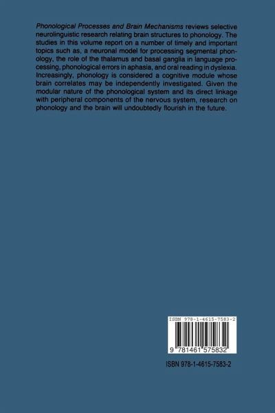 Phonological Processes and Brain Mechanisms reviews selective neurolinguistic research relating brain structures to phonology. The studies in the volume report on a number of timely and important topics, such as a neuronal model for processing segmental phonology, the role of the thalamus and basal ganglia in language processing, and oral reading in dyslexia. Increasingly, phonology is considered a cognitive module whose brain correlates may be independently investigated. Given the modular nature of the phonological system and its direct linkage with peripheral components of the nervous system, research on phonology and the brain will undoubtedly flourish in the future. The chapters in this volume give substance to this future.