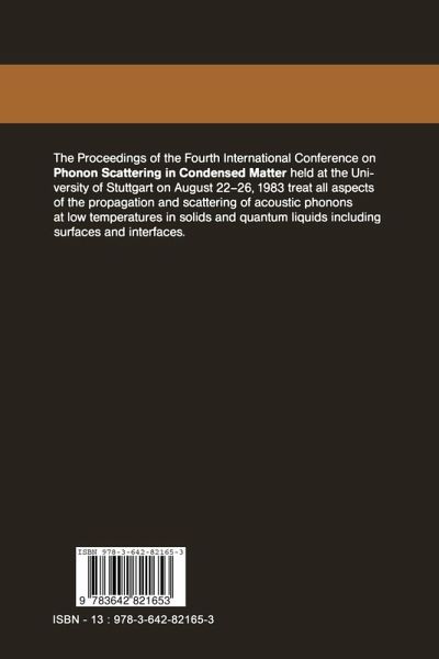 This volume contains the proceedings of the Fourth International Conference on Phonon Scattering in Condensed Matter held from August 22-26, 1983 at the University of Stuttgart. The preceding conferences were organized at Saint Maxime and Paris in 1972, at the University of Nottingham in 1975, and at the Brown University Providence/Rhode Island in 1979. The Stuttgart conference, like the preceding conferences, was mainly con cerned with "propagating" high-frequency acoustic phonons, mechanical waves and heat up to the lattice limiting frequency. Lattice dynamics, optical pho nons, phase transitions, etc., were included as far as they are involved in acoustical phonon scattering, propagation and generation. In this context the conference covered all aspects of acoustical phonon physics, especially generation of phonons, propagation, scattering and detection. Since acoustic phonons participate in most energy-transfer processes in solids and liquids, the field of interest is growingrapidly. Therefore exciting new developments of acoustic phonon physics could be presented at the Stuttgart conference as well as important progress with respect to well-known problems, as, for example, the Kapitza resistance. Two hundred and six scientists from 21 countries attended the conference. Thirteen invited papers and 105 contributed papers, with 34 as posters, were presented. The discussions are included in this volume. A discussion session on large wave vector phonons was organized and chaired by V. Narayanamurti. A discussion session on phonon scattering at interfaces was organized and chaired by R.O. Pohl.
