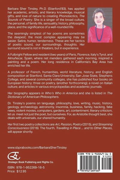 Barbara Sher Tinsley, Ph.D. (Stanford'83), has applied her academic, artistic, and literary knowledge, musical gifts, and love of nature to creating Phonotactics, The Sounds of Poetry. She is a singer of the broad culture, the personal, of family life, sensuality, history, philosophy, place, and the significance of a well-rounded life. The seemingly simplest of her poems are sometimes the deepest; the most complex appearing may be easier. Satire, humor, tenderness. These are her tactics of poetic sound, our surroundings, thoughts. Her surround sound is not in theaters, but in experience. A Fulbright Fellow and resident (two years) of Paris, Florence, Italy's Tyrol, and Almuñecar, Spain, where net menders gathered each morning, inspired a painting and a poem. Her long residence in California's Bay Area has enriched her life. A professor of French, humanities, world literature, history, and English composition at Stanford, Santa Clara University, San Jose State, Stephens College, and several community colleges, she has published four books on European history; three on poetry, (another forthcoming); a novel on Italian culture; and articles in various encyclopedias and academic journals. Her biography appears in Who's Who in America and she is listed in The Dictionary of American Philosophers. Dr. Tinsley's poems on language, philosophy, love, writing, music, history, geology, archaeology, astronomy, insomnia, business, family, hacking, fake news, violent movies, computers, gardens, art, contentment, literary criticism, let us meet not just the poet, but ourselves. For, as Aristotle thought best, she deals with universals, our shared humanity. Her first two poetry collections are Art, Passion, Poetry (2015), and Streaming Consciousness (2016). The fourth, Travelling in Place ... and to Other Places, will appear shortly. As one perceives from my dedication, music was on my mind - my uncles' and my own - to create poetry that is truly musical, with meter, rhyme, and compelling themes. Phonotactics was a word I discovered thumbing through my dictionary while looking for another word. I had no idea what it meant, but learned that sound involves tactics and techniques, all involved in poetry. My own poems are quite varied, from Renaissance villanelles and sonnets to philosophical musings on great thinkers. The poetry honors historical monuments to monuments dedicated to man's cultural achievements, and to their corruption or destruction by barbarians, old and modern. My first two poetry collections are Art, Passion, Poetry (2015), and Streaming Consciousness (2016). The fourth, Travelling in Place ... and to Other Places, will appear shortly.